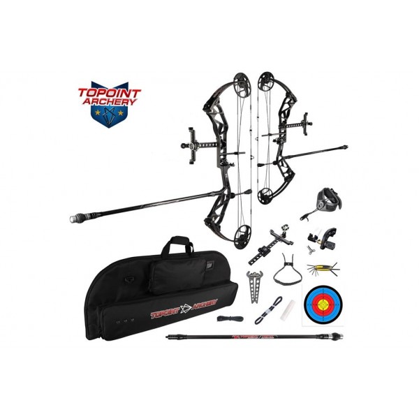 Le pack comprend : viseur avec lunette, repose-flèche à poulies, stabilisateur, viseur peep, décocheur à index, dragonne, dragonne, support d'arc, étui souple, cible, cire pour corde, corde de rechange pour boucle en D et clés Allen.